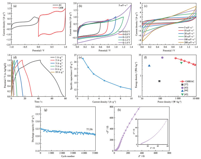 图 9. C6M||AC的电化学性能:(a) AC和C6M在5 mV·s-1时的CV曲线; (b) 不同电位窗口内、5 mV·s-1下的CV曲线; (c) 在不同扫描速率下的CV曲线; (d) GCD曲线; (e) 倍率性能; (f) 与其他器件的Ragone图对比; (g) 在10 A·g-1下的循环性能; (h) EISFigure 9. Electrochemical performance of C6M||AC: (a) CV curves of AC and C6M at 5 mV·s-1; (b) CV curves at different potential windows at 5 mV·s-1; (c) CV curves at various scan rates; (d) GCD curves; (e) rate capacitance; (f) Ragone plots compared with other devices; (g) cycling performance at 10 A·g-1; (h) EISInset: corresponding enlarged spectrum.