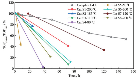 * Reaction conditions: 0.1 μmol complex 1-Cl in 1 mL EtOH, pCO2pH2=1∶1, 1.2 mol·L-1 aqueous solution of KOH (10 mL), 150 ℃, 5 h.