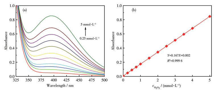 Figure 1  (a) UV-visible adsorbed spectra and (b) the corresponding standard curve for H2O2 detection based on potassium titanium oxalate photometric method