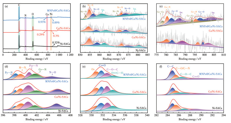 Figure 3  (a) XPS survey and high-resolution XPS spectra of (b) Ni2p, (c) Co2p, (d) N1s, (e) O1s, and (f) C1s for MNPs@Co/Ni-SACs, Co/Ni-SACs, and Ni-SACs