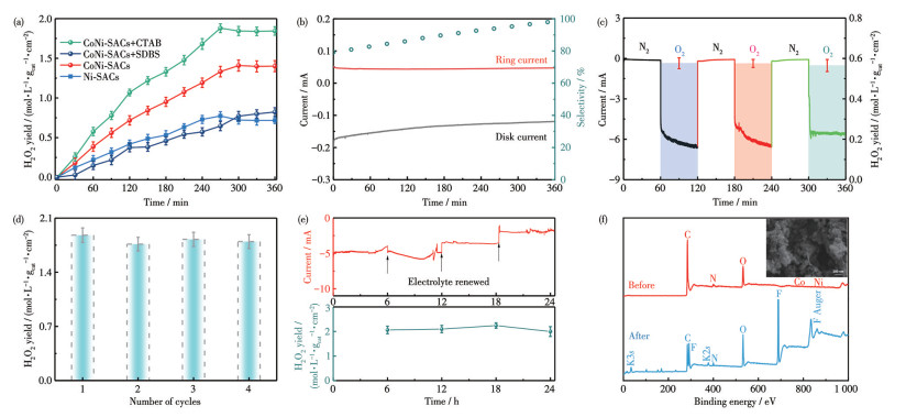 Figure 5.  Electrocatalytic performance of catalysts in H2O2 synthesis: (a) H2O2 yield-time curves of different catalytic systems; (b) disk current, ring current, and selectivity curves of Co/Ni-SACs at 0.4 V (vs RHE) during the electrocatalytic process; (c) current response and H2O2 yield curves by alternating N2 and O2-saturated electrolyte every 60 min; (d) recyclability of Co/Ni-SACs in the catalytic synthesis of H2O2; (e) current response and H2O2 yield curves of Co/Ni-SACs during long-term electrocatalysis; (f) XPS survey spectra of Co/Ni-SACs before and after electrocatalysis