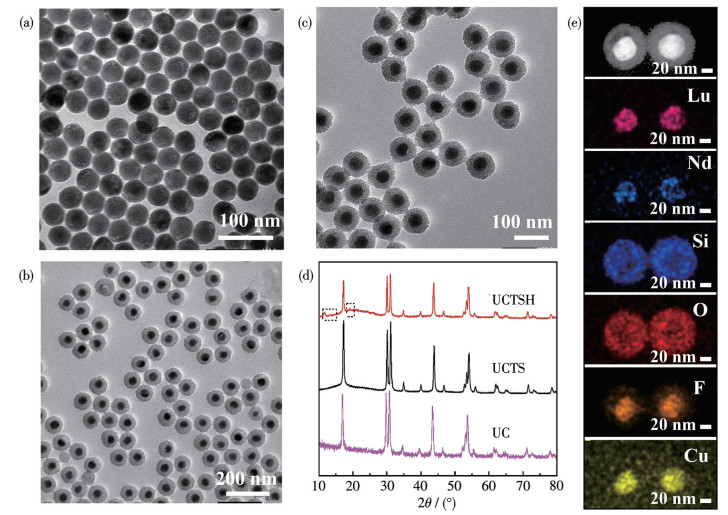 The synthetic procedure of UCTSH is presented in Scheme 1. First, UC was fabricated via a robust binary sodium strategy[26] and an epitaxial growth way[27] for the first time. The core-shell structure UC can be excited by 808 nm light to effectively avoid the thermal effect caused by excitation because of the minimum absorption of biological tissue at this NIR wavelength. When excited by an 808 nm laser, UC performed an efficient upconversion, which is very beneficial for the subsequent application of resonance energy transfer. The UC nanoparticles were monodispersed and uniform with an average diameter of 41.2 nm (Fig. 1a). The premodified Ce6 and TFS were covalently conjugated on the mSiO2 layer along with coating the mSiO2 shell on UC, and after that, a Cu-based MOF shell (HKUST-1) was directly grown on the mSiO2 layer through a facile room temperature synthesis. Fig. 1b showed that the particle size increased to around 80.0 nm after coating with mSiO2. However, the particle size did not increase significantly after coating the MOF′s shell (Fig. 1c). Besides, the XRD patterns of the as-prepared core-shell UC, UCTS, and UCTSH are displayed in Fig. 1d. The diffraction peaks of UC were kept well in all the samples. In the XRD pattern of UCTS, there was a broad diffraction peak at 2θ=22° besides the characteristic sharp peaks of UC, implying the successful mSiO2 coating[28]. In comparison with UCTS, the XRD peaks of UCTSH at 11.6°, 13.4°, and 19.2° can be indexed to the (222), (422), and (731) planes of Cu-MOFs, respectively[29-30]. This proves the successful preparation of Cu-MOFs. The even distribution of Lu, Nd, Si, O, F, and Cu element signals further suggests the successful fabrication of mSiO2 and Cu-MOFs coated upconversion nanomaterials in Fig. 1e.