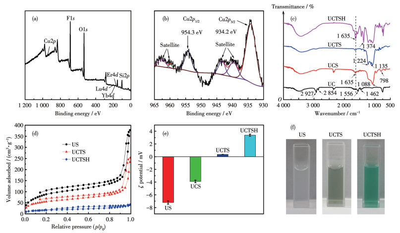 Figure 2  (a) XPS survey spectra and (b) Cu2p high-resolution XPS spectra of UCTSH; (c) FTIR spectra of UC, UCS, UCTS, and UCTSH; (d) N2 adsorption-desorption isotherms of US, UCTS, and UCTSH; (e) ζ potentials of US, UCS, UCTS, and UCTSH in water; (f) Images of US, UCTS, and UCTSH dispersions at 25 ℃