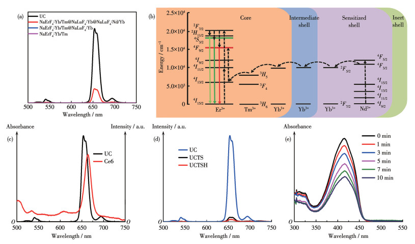 Figure 3  (a) UCL spectra of the different nanoparticles; (b) Nd3+→Yb3+→Tm3+→Er3+ series sensitized energy transfer mechanism of UC under 808 nm excitation; (c) Luminescence spectra of UC and the absorption spectra of Ce6; (d) UCL spectra of UC, UCTS, and UCTSH; (e) Absorbance changes of DPBF treated with UCTSH after 808 nm laser irradiation at different time points