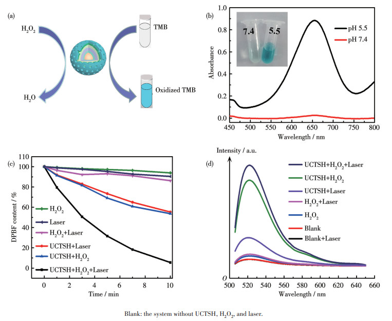 Figure 4  (a) Scheme of TMB oxidation catalyzed by UCTSH; (b) Colorimetric detection of ·OH generated by UCTSH at different pH values based on TMB assay (inset: the digital photos of different pH values); (c) Depletion of DPBF underwent different treatments with or without 2 mmol·L-1 H2O2; (d) Fluorescence spectrum changes of DCFH-DA underwent different treatments with or without 5 mmol·L-1 H2O2 (the reaction time was 30 min after irradiation with 808 nm light for 10 min)