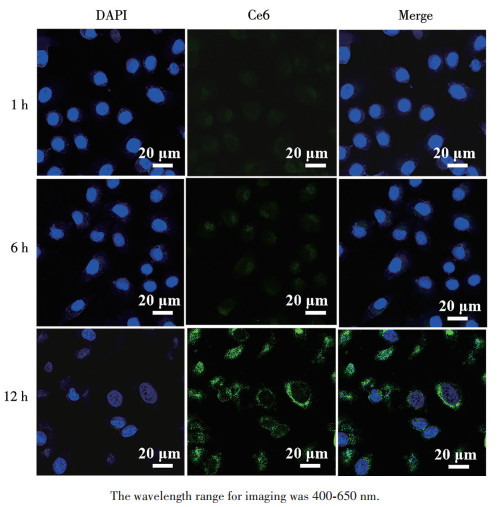 Before the in vitro anticancer assay, the cell uptake behavior of the prepared UCTSH was studied. The MCF-7 cells were incubated with UCTSH for 1, 6, and 12 h, respectively, and the related CLSM images are shown in Fig. 5. The cell nuclei were labeled with 4′,6-diamidino-2-phenylindole with blue fluorescence; the green fluorescence was derived from the loaded Ce6 molecules, and the merged channel was also provided. After UCTSH (125.0 μg·mL-1) interacted with the cells for 1 h, green fluorescence of Ce6 was not seen around the nucleus. With the increase in time, the apparent green fluorescence of Ce6 was observed around the nucleus after incubation of MCF-7 cells with UCTSH for 12 h, showing the efficient uptake of UCTSH nanocomposites by cells.