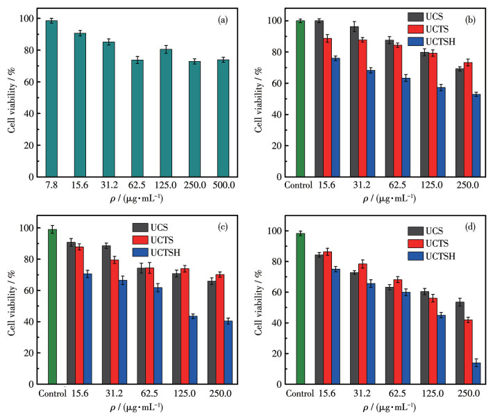 Figure 6.  (a) Cell viability of L929 incubated with UCTSH at various mass concentrations; (b) Viability of MCF-7 cells after incubation with UCS, UCTS, and UCTSH without irradiation; (c) Viability of MCF-7 cells after incubation with UCS, UCTS, and UCTSH with irradiation for 5 min by an 808 nm laser; (d) Viability of MCF-7 cells after incubation with UCS, UCTS, and UCTSH with irradiation for 10 min by an 808 nm laser