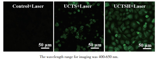 The uptake of UCTSH by cancer cells was evaluated. 5×103 of MCF-7 cells were first seeded in 20 mm glass-bottom cell culture dishes. After incubation at 37 ℃ for 24 h, the culture medium was then replaced with 125.0 μg·mL-1 of UCTSH suspended in fresh medium and continued to culture for different times. After different times of incubation, cell nuclei were stained with DAPI. Finally, MCF-7 cells were observed by CLSM.