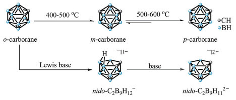 碳硼烷[1](carborane)是一类由硼、氢和碳3种元素构成的多面体硼簇化合物。其中,1,2-二碳-闭式碳硼烷是典型代表,其是由2个碳氢顶点和10个硼氢顶点组成的二十面体笼状硼簇合物。根据2个碳原子顶点在碳硼烷结构中的相对位置,该类化合物可分为邻位(o-)、间位(m-)和对位(p-)三种异构体,在高温条件下邻位碳硼烷能够转化为间位碳硼烷和对位碳硼烷(图 1)。此外,在醇盐、氢氧化物、氟化物等路易斯碱存在的条件下,闭式碳硼烷会发生脱硼化反应(图 1),生成巢式(nido-)碳硼烷负一价阴离子[2]。碳硼烷因其独特的三维芳香性、优异的化学稳定性和良好的生物相容性而备受瞩目[3-4]。这些特性为碳硼烷及其衍生物赋予了广泛的潜在应用价值,使其在有机化学、材料化学、药物化学、生物医学等多个领域展现出广阔的应用前景[5-18],尤其是在生物医学领域,碳硼烷衍生物可以作为硼中子俘获疗法(BNCT)的硼携带剂,为相关疾病的治疗提供了新选择[19-26]。