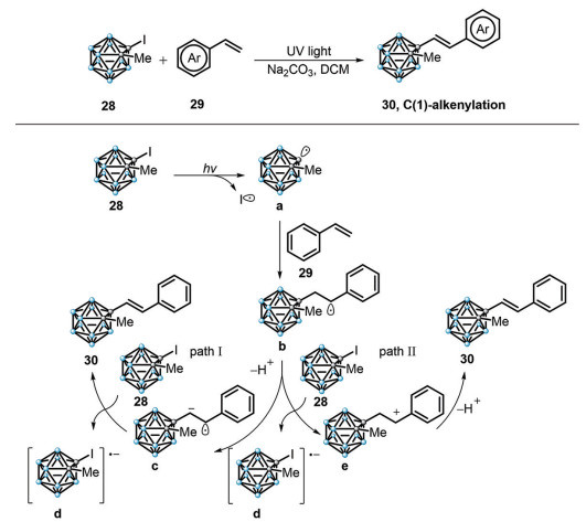 过去合成碳硼烷烯基化合物的方法通常涉及过渡金属、有毒试剂和苛刻的反应条件,且底物范围有限。2022年,谢作伟课题组报道了紫外光诱导C(1)位点碘代碳硼烷与非活化烯烃的偶联反应[72](图 14)。该方法具有条件温和、无需过渡金属催化,广泛的底物适用性和良好的官能团耐受性等优点。该工作提出的可行性研究机理如图 14所示。首先,在紫外光照射下,C(1)位点碘代碳硼烷28的C—I键均裂生成碳硼烷碳中心自由基a。随后, 该自由基a与苯乙烯29发生反应生成烷基自由基中间体b。烷基自由基中间体b生成目标化合物可能会经过2种路径。路径一:该中间体b在碱的作用下发生去质子化形成自由基阴离子c。自由基阴离子c被C(1)位点碘代碳硼烷28氧化生成C(1)位点烯基碳硼烷化合物30,同时生成自由基阴离子d。路径二:该中间体b可能被C(1)位点碘代碳硼烷28氧化生成阳离子e,进一步在碱的作用下发生去质子化生成C(1)位点烯基邻位碳硼烷化合物30。