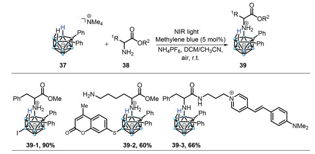 2025年,燕红课题组报道了利用近红外光诱导巢式碳硼烷与氨基酸/寡肽偶联的反应[75](图 18)。通过设计一系列EDA复合物,使用X射线单晶衍射技术、密度泛函理论计算和光谱实验等,验证利用近红外光活化巢式碳硼烷的可行性。最终,成功使用低能量的近红外光诱导巢式碳硼烷的活化,合成了一系列碳硼烷氨基酸和寡肽衍生物。通过该方法设计并合成了“三位一体”的硼中子俘获疗法(BNCT)候选药物分子,包含硼簇、靶向基团和示踪基团等3个要素。同时,该工作合成了一种具有聚集诱导发光(AIE)性质的碳硼烷衍生物39-3,并对该化合物进行了荧光发射光谱实验和细胞生物成像实验研究。结果显示,该化合物表现出良好的AIE性质和荧光成像能力。