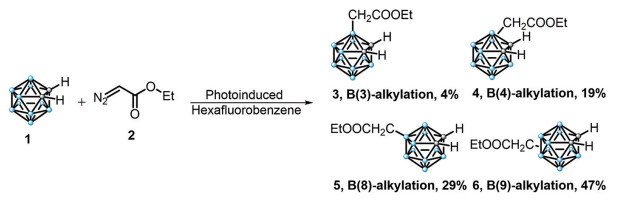 1983年,Jones课题组报道了第一例光诱导的碳硼烷B—H键官能团化的反应[64](图 2)。在光照条件下,使用邻位碳硼烷和重氮乙酸乙酯作为底物,全氟苯作为溶剂,得到了4种混合的不同位点B—H键官能团化的产物。反应过程中,通过光诱导原位生成卡宾中间体,该中间体插入B—H键中,经三元环过渡态,得到不同位点取代的碳硼烷衍生物。