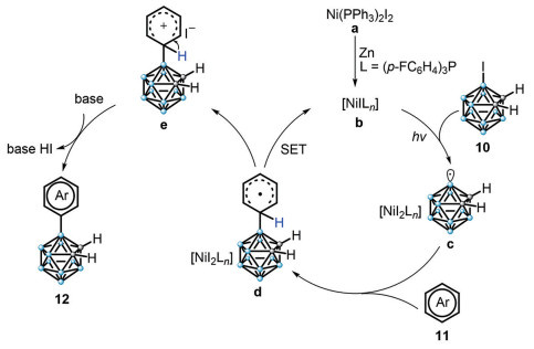 2022年,谢作伟课题组通过可见光诱导的镍催化交叉偶联反应,实现了不同位点的碘代邻位碳硼烷与(杂)芳基化合物的高效偶联[66](图 5)。该研究在邻位碳硼烷B(3)、B(4)、B(9)位点上分别生成了硼中心自由基,并揭示了邻位碳硼烷结构中不同顶点的电荷分布与自由基亲电性的关系,其活性顺序从大到小依次为B(3)、B(4)、B(9)。该方法具有广泛的底物兼容性和优异的反应收率,反应在室温下即可高效进行。该研究的关键创新在于将光诱导与镍催化相结合,利用单电子转移过程生成硼中心自由基,并通过控制实验验证了自由基的参与。该课题组提出的反应机理如图 6所示。首先,二价镍配合物a在金属锌的作用下被还原为一价镍配合物b。在蓝光照射下,一价镍配合物b从B(3)位点碘代邻位碳硼烷10中攫取碘原子,生成硼中心自由基中间体c。随后,该中间体c对(杂)芳烃发生亲电进攻,形成中间体d。中间体d经历单电子转移过程,生成相应的阳离子中间体e,同时生成一价镍配合物b。最后,中间体e经去质子化反应生成B(3)位点芳基邻位碳硼烷衍生物12。
