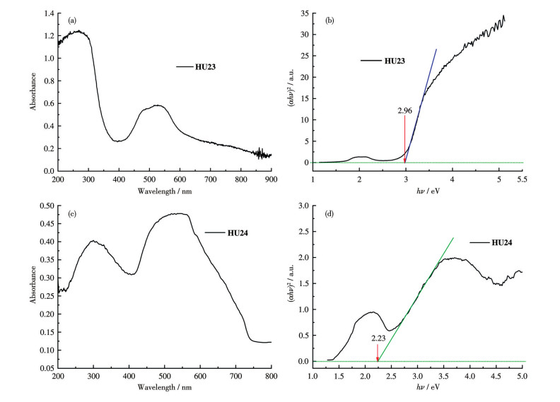• Under hydrothermal and solvothermal conditions, two novel cobalt-based complexes, {[Co2(CIA)(OH)(1, 4-dtb)]·2H2O}n (HU23) and {[Co2(CIA)(OH)(1, 4-dib)]·3.5H2O·DMF}n (HU24), were successfully constructed by coordinatively assembling the semi-rigid multidentate ligand 5-(1-carboxyethoxy)isophthalic acid (H3CIA) with the N-heterocyclic ligands 1, 4-di(4H-1, 2, 4-triazol-4-yl)benzene (1, 4-dtb) and 1, 4-di(1H-imidazol-1-yl)benzene (1, 4-dib), respectively, around Co2+ ions. Single-crystal X-ray diffraction analysis revealed that in both complexes HU23 and HU24, the CIA3- anions adopt a κ7-coordination mode, bridging six Co2+ ions via their five carboxylate oxygen atoms and one ether oxygen atom. This linkage forms tetranuclear [Co4(μ3-OH)2]6+ units. These Co-oxo cluster units were interconnected by CIA3- anions to assemble into 2D kgd-type structures featuring a 3, 6-connected topology. The 2D layers were further connected by 1, 4-dtb and 1, 4-dib, resulting in 3D pillar-layered frameworks for HU23 and HU24. Notably, despite the similar configurations of 1, 4-dtb and 1, 4-dib, differences in their coordination spatial orientations lead to topological divergence in the 3D frameworks of HU23 and HU24. Topological analysis indicates that the frameworks of HU23 and HU24 can be simplified into a 3, 10-connected net (point symbol: (410.63.82)(43)2) and a 3, 8-connected tfz-d net (point symbol: (43)2(46.618.84)), respectively. This structural differentiation confirms the precise regulatory role of ligands on the topology of metal-organic frameworks. Moreover, the ultraviolet-visible absorption spectra confirmed that HU23 and HU24 have strong absorption capabilities for ultraviolet and visible light. According to the Kubelka-Munk method, their bandwidths were 2.15 and 2.08 eV, respectively, which are consistent with those of typical semiconductor materials. Variable-temperature magnetic susceptibility measurements (2-300 K) revealed significant antiferromagnetic coupling in both complexes, with their effective magnetic moments decreasing markedly as the temperature lowered.