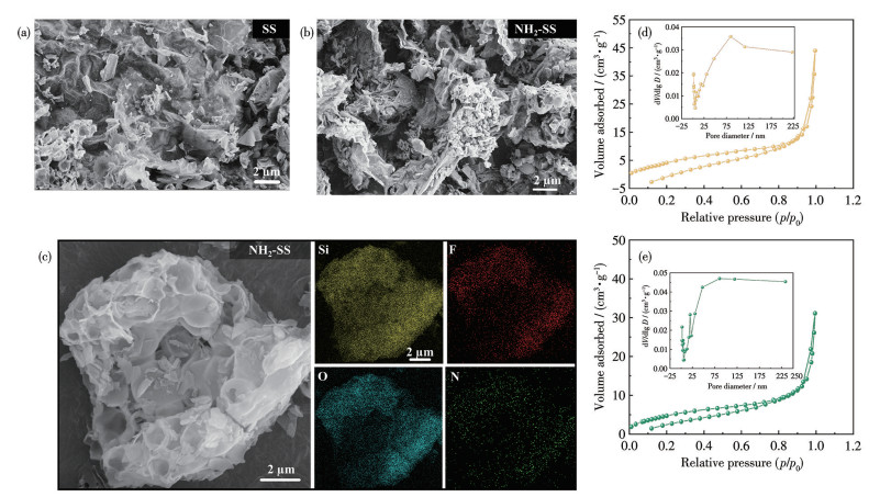 SS shown in Fig.1a exhibited an irregular, densely agglomerated block structure with large pores and limited fine block-like surface features, whereas NH2-SS in Fig.1b showed a porous and loose structure with a rougher surface. As shown in Fig.1c, SEM images and energy dispersive spectroscopy (EDS) mappings of NH2-SS at higher magnification revealed partial porosity on the surface. EDS analysis indicates the presence of Si, F, and O elements, alongside N, confirming the successful introduction of amino groups (—NH2). The pore structure and pore size distribution of NH2-SS and SS were further investigated via nitrogen adsorption-desorption experiments, with results shown in Fig.1d and 1e. It can be seen that NH2-SS contained a large number of mesopores and may also include some open pores; this modification treatment significantly improved the pore structure and adsorption performance of SS. The specific surface area of NH2-SS was 23 m2·g-1, which was higher than that of SS (16 m2·g-1). This is because acid treatment plays multiple roles in SS modification: it not only effectively removes impurities from the material surface and forms a specific pore structure, but also reacts with F elements in the SS matrix to generate a small amount of hydrofluoric acid (HF); HF exerts a mild etching effect on SS, thereby increasing the specific surface area of the modified material.
