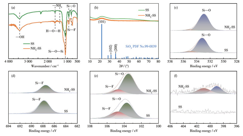 Sample Mass fraction of F / % Mass fraction of SiO2 /% Mass fraction of trace element / % SS 18.771 78.313 2.916 NH2-SS 13.780 85.645 0.575 FTIR spectra of NH2-SS in Fig. 2a revealed a broad absorption peak near 3 400 cm-1 corresponding to the stretching vibration of the hydroxyl groups (—OH), confirming their presence on the surface. Additionally, there was also an absorption peak near 1 640 cm-1 attributed to the bending vibration of H—O—H, a peak of the bending vibration of —NH2 at 1 511 cm-1, urther confirm the success of amination modificationand absorption peaks in the region of 1 100-800 cm-1 attributed to the bending vibration of Si—O—Si and the vibration of Si—F and Si—O. Among them, the Si—O shift of NH2-SS may be attributed to the change in F content and the introduction of —NH2 after modification[24]. To investigate the phase structure of NH2-SS, XRD characterization was performed. As shown in Fig.2b, the XRD patterns showed that both SS and NH2-SS had distinct peaks around 22°, which correspond to the (101) crystal plane of SiO2 (PDF No.99-0039), indicating that SS had an amorphous structure similar to SiO2. Based on the XPS analysis results, NH2-SS exhibited a distinct Si—O bond characteristic peak at 532.8 eV in the O1s spectrum (Fig.2c), and a prominent Si—F bond characteristic peak at 687.7 eV in the F1s spectrum (Fig.2d). In contrast, SS showed no such signal, confirming the presence of F. The Si2p spectrum further indicates that NH2-SS had a Si—F bond at 104.8 eV (Fig.2e), while retaining the Si—O peak at 103.5 eV, demonstrating its structure as F-containing SiO2. Additionally, the N1s spectrum revealed an —NH2 characteristic peak at 398.8 and a free NH4+ characteristic peak at 401.0 eV for NH2-SS (Fig.2f), with no N signal detected in SS. The result confirms the successful introduction of —NH2 modification.