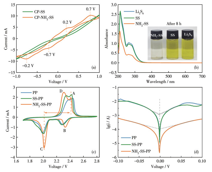 Figure 3 (a) CV curves of CP-NH2-SS and CP-SS symmetric batteries at 5 mV·s-1; (b) UV-Vis spectra of the Li2S6 solutions with NH2-SS, SS, and Li2S6 solutions; (c) CV curves of Li-S batteries based on NH2-SS-PP, SS-PP, and PP at 0.1 mV·s-1; (d) Tafel curves of Li||Li symmetric batteries based on NH2-SS-PP, SS-PP, and PP