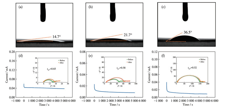 ) by Eq.1. As shown in Fig.5d-5f, the Li+ ion migration numbers of NH2-SS-PP, SS-PP, and PP were 0.65, 0.58, and 0.52, respectively, indicating that all three groups of interlayers had a certain effect on the migration of Li+. Meanwhile, SS-PP can improve the interfacial compatibility between the polymer electrolyte and lithium, and promote the Li+ ion migration effectively. Among them, NH2-SS-PP had the highest Li+ migration number, which indicates that the better affinity (smaller contact angle) of NH2-SS-PP modified to the electrolyte makes the Li+ transport more usual and helps the Li+ ion migration.$ t_{\mathrm{Li}^{+}} $ Figure 5