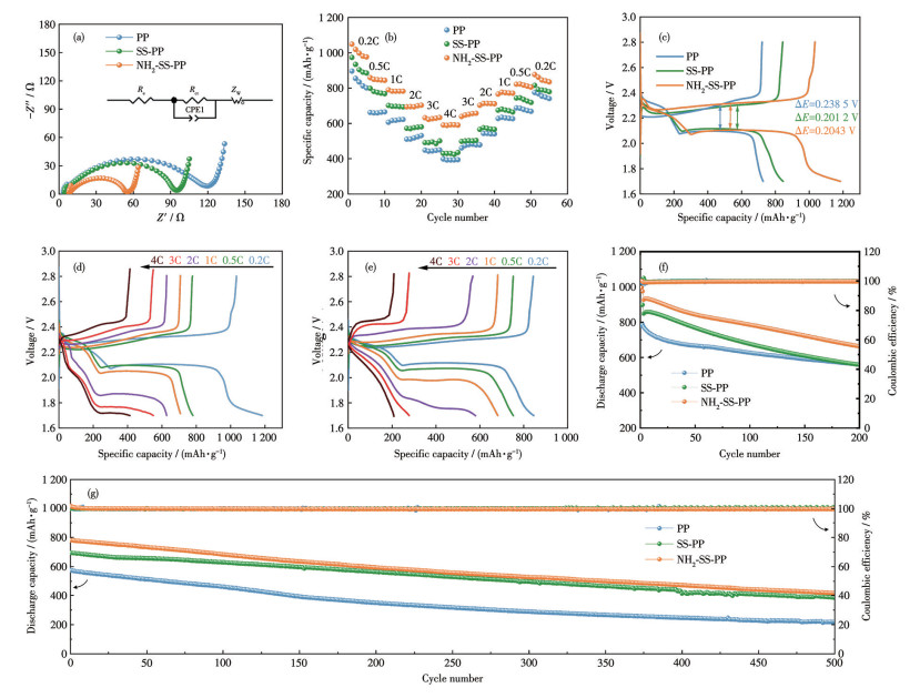 Fig. 6c presents the GCD curves at 0.2C for batteries with various interlayer materials. The discharge curves displayed two plateaus, and the charging process showed one plateau, all corresponding to the sulfur redox reactions in Li-S batteries. The battery based on NH2-SS-PP exhibited a high initial discharge capacity of 1 048 mAh·g-1 and a low polarization voltage of 0.204 3 V. In comparison, the batteries based on SS-PP (711 mAh·g-1, 0.201 2 V) and PP (616 mAh·g-1, 0.238 5 V) showed lower capacities and different polarization voltages. The battery based on NH2-SS-PP provided a more stable discharge plateau, which accelerates the redox kinetics converting LiPSs to the final product Li2S, enhances sulfur utilization, and more effectively suppresses the shuttling of LiPSs. Further GCD tests at various rates (Fig. 6d and 6e) reveal that as the current density increased, the battery based on NH2-SS-PP maintained longer discharge plateaus and higher capacities than SS-PP, even at a high rate of 4C. This demonstrates that the battery based on NH2-SS-PP sustains a relatively stable voltage output.