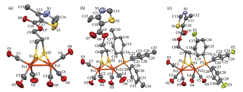 The structures of three complexes were further identified by X-ray crystallography. The molecular structures, drawn as thermal ellipsoids at a 30% probability, are shown in Fig.1, and the selected bond parameters are listed in Table 2. Complexes 2 and 3 crystallize in monoclinic space groups C2/c and P21/n, respectively, whereas complex 4 crystallizes in triclinic space group P1. All the complexes consist of a di-iron core ligated by a bridged dithiolate, which is linked with a thiazole moiety through an ester group and six terminal carbonyls or five terminal carbonyls and a phosphine ligand. The occupation of the phosphine ligands in complexes 3 and 4 is apical to the distorted octahedral arrangement of the Fe2 atom, in agreement with the similar analogues[29-30]. The Fe1—Fe2 bond distances of complexes 3 [0.250 48(13) nm] and 4 [0.250 65(12) nm] are slightly longer than that of complex 2 [0.250 17(5) nm], possibly due to the electronic effect of the phosphine ligand, but much shorter than those of diphosphine-chelated analogues[31-32] as well as natural [FeFe]-H2ases[9-10]. It is noteworthy that the methyl carbon C12 attached to the thiazole ring in complex 3 is disordered over two sites, with an occupancy of 0.57(2).