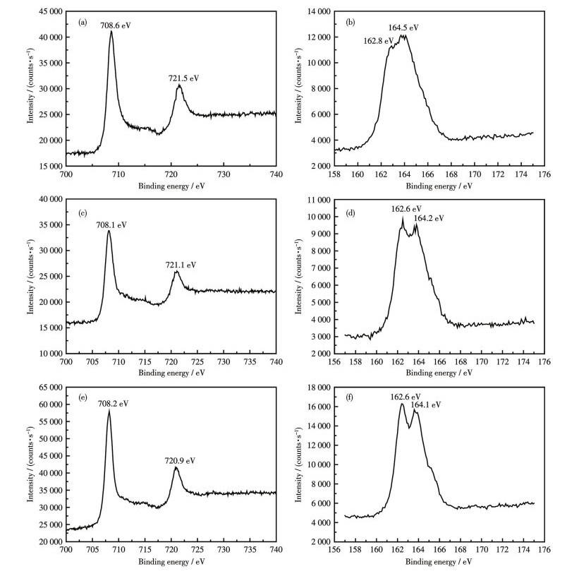 To check the oxidation states of iron and sulfur, complexes 2-4 were characterized by XPS analysis. As shown in Fig.2a, two peaks centered at 708.6 and 721.5 eV were observed for the 2p1/2 and 2p3/2 ionizations of the Fe+ ions in complex 2, respectively, similar to the previously-reported di-iron analogues[33-35]. As shown in Fig.2b, two peaks centered at 162.8 and 164.5 eV were observed for the 2p ionizations of the thiolate and thiazole sulfur atoms in complex 2, respectively, because Dey et al. reported 161.9[33] or 162.4 eV[34] for the thiolate sulfur atoms of the di-iron analogues. It can also be seen from Fig.2c and 2e that two peaks centered at 708.1, 721.1 eV (for complex 3) and 708.2, 720.9 eV (for complex 4) were observed for the Fe+ ions in complexes 3 and 4. Similarly, as shown in Fig.2d and 2f, two peaks centered at 162.6, 164.2 eV (for complex 3) and 162.6, 164.1 eV (for complex 4) were observed for the thiolate and thiazole sulfur atoms in complexes 3 and 4. It is worth pointing out that the binding energies of complexes 3 and 4 shift to lower energies relative to complex 2, probably due to the effect of the phosphine ligand.