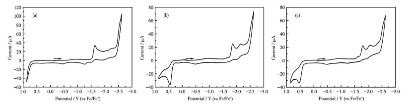 To study the redox activity of these complexes, cyclic voltammetry (CV) was conducted in an acetonitrile solution with nBu4NPF6 as the supporting electrolyte at a scan rate of 0.1 V·s-1. As shown in Fig.3a, the CV curve of complex 2 only possessed one irreversible reduction event at Epc=-1.64 V (vs Fc/Fc+). With reference to the previous study[36], we can designate this event to be the one-electron process FeⅠFeⅠ+e→FeⅠFe0, as the aforementioned XPS analysis has confirmed the oxidation state of Fe+ in the di-iron complexes. In contrast, as shown in Fig.3b, the CV curve of complex 3 possessed two irreversible reduction events at Epc=-1.86 and -2.15 V together with one irreversible oxidation event at Epa=0.46 V. The assignments of the second reduction event and oxidation event are one-electron processes FeIFe0+e→Fe0Fe0 and FeIFeI-e→FeIFeⅡ, respectively, according to the reference results[36]. It is noteworthy that the first reduction event of complex 3 was moving negatively by 0.22 V as compared to complex 2, consistent with the fact that the phosphine ligand increases the electron density on the di-iron core. Analogous to complex 3, as shown in Fig.3c, the CV curve of complex 4 possessed two irreversible reduction events at Epc=-1.80 and -2.07 V together with one irreversible oxidation event at Epa=0.54 V. Notably, all potentials for complex 4 were moving cathodically relative to the corresponding potentials for complex 3 which is consistent with the fact that tri(p-tolyl)phosphine is a better electron donor than tris(4-fluorophenyl)phosphine bearing an electron-withdrawing group.