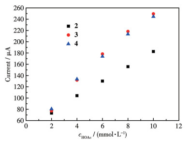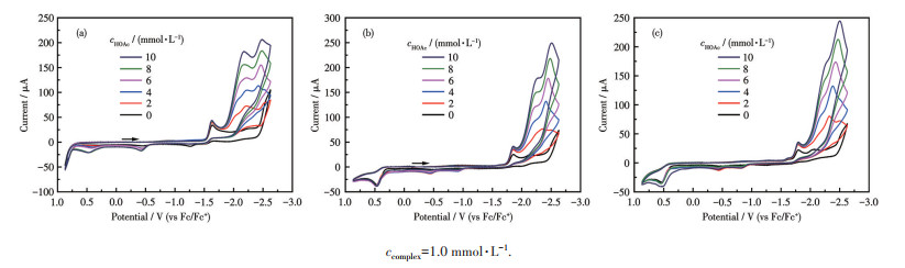 Electrocatalytic proton reduction by di-iron analogues has been extensively studied[37-39]; thus, in this work, we carried out the hydrogen evolution reaction by adding a proton source into the acetonitrile solution under the electrochemical conditions. Fig.4 shows the CV curves of three complexes upon addition of 2-10 mmol·L-1 acetic acid. It can be seen from Fig.4a that upon addition of the acid, the height of the reduction event was slightly enhanced; however, a new reduction event at ca. -2.2 V appeared, and its current height increased remarkably with continuous addition of the acid. This catalytic potential moved positively by ca. 0.3 V with respect to the acid blank without the catalyst[40]. Further, as shown in Fig.5, the current height increased linearly with the acid concentration. The above-mentioned observations imply that proton reduction catalyzed by complex 2 occurs in this system[41-43]. Besides, another catalytic reduction event at ca. -2.5 V was also observed, and we propose that this peak corresponds to the direct reduction of the acid at the electrode. Likewise, as shown in Fig.4b and 4c, catalytic waves at ca. -2.3 V were observed for complexes 3 and 4 along with the corresponding linear relationship of current height against the acid concentration (Fig.5), revealing that both complexes can also catalyze the proton reduction to H2 under the same conditions.