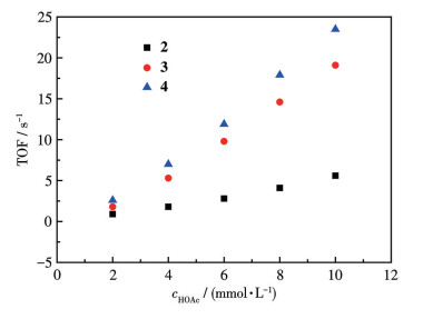 To evaluate the catalytic efficiency of these complexes in the hydrogen evolution reaction, TOF was used as a parameter for comparison. TOF can be calculated by a reported method[44] and the relationship of TOF with the acid concentration is displayed in Fig.6. From Fig.6, we can conclude that the catalytic efficiencies of complexes 3 and 4 were better than that of complex 2 which is reflecting that the enhancement of electron density on the di-iron core will increase the catalytic efficiency for H2 production, probably due to the easily binding for proton. In addition, the catalytic efficiency of complex 4 was the best among these complexes with a TOF of 23.5 s-1 at 10 mmol·L-1 HOAc concentration.