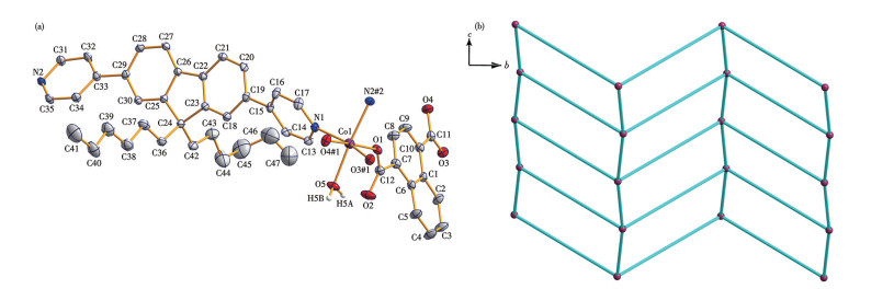 Single-crystal X-ray diffraction confirms that both 1 and 2 are isostructural frameworks with the monoclinic P21/c space group (Fig.1 and 2). Thus, only the structure of 1 is described herein in detail. As illustrated in Fig.1, complex 1 contains one Co2+ cation, one ndc2- anion, one hfdp ligand, one coordinated water molecule, and one lattice DMA molecule in its asymmetric unit. The Co1 center adopts a distorted octahedral coordination geometry, binding to two nitrogen atoms from distinct hfdp ligands and to four oxygen atoms supplied by two ndc2- ligands and one coordinated water molecule. The Co—N bond lengths are 0.214 4(3) and 0.215 9(3) nm, respectively, while Co—O distances range from 0.208 4(2) to 0.220 7(3) nm.