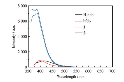 Since CPs with fluorene ligands generally exhibit significant luminescence properties, the photoluminescence behaviors of compounds 1, 2, H2ndc, and hfdp were investigated in DMF solution at room temperature[8-10]. As shown in Fig.4, the H2ndc ligand exhibited an emission maximum at 414 nm (λex=364 nm). The hfdp ligand displayed a fluorescence peak at 390 nm (λex=347 nm). The emission spectra of 1 and 2 showed intense peaks at 385 nm (λex=344 nm for 1, λex=339 nm for 2). Compared to the hfdp ligand, both complexes demonstrated blue-shifted emissions, with a hypsochromic shift of 5 nm. These luminescence behaviors of 1 and 2 may originate from nπ* or ππ* electronic transitions within the hfdp ligand upon coordination[10]. Notably, 1 and 2 exhibited significantly enhanced fluorescence intensity relative to the free ligands, attributed to metal-ligand coordination increasing ligand rigidity and reducing non-radiative energy loss.