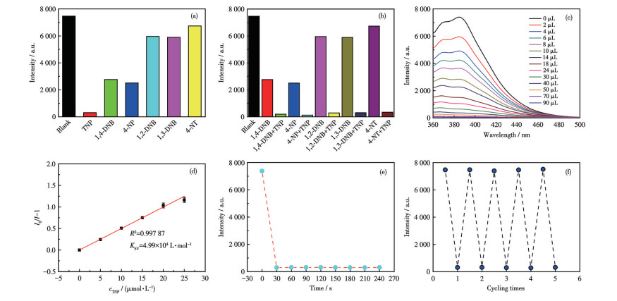 Figure 5  (a) Fluorescence intensity of 1 in the presence of different nitro-explosives; (b) Fluorescence intensity of 1 in the presence of other nitro-explosives and TNP; (c) Fluorescence spectra of 1 upon gradual addition of TNP solution (5 mmol·L-1); (d) S-V plot for 1 detecting TNP in DMF suspension at the low concentration (0-25 μmol·L-1); (e) Time-dependent fluorescence intensity for 1 detecting TNP; (f) Cyclic stability for 1 detecting TNP