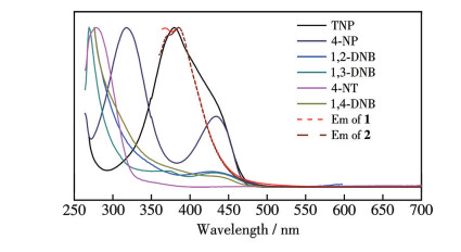 To elucidate the fluorescence quenching mechanisms of 1 and 2 induced by TNP, UV-Vis absorption spectra of TNP, and other nitroaromatic analytes (i.e., 4-NP, 1, 2-DNB, 1, 3-DNB, 1, 4-DNB, and 4-NT) were measured in DMF solution. As shown in Fig.7, a significant spectral overlap existed between the emission bands of the complex and the absorption bands of TNP. This overlap between the analyte (TNP) and the sensors (1 or 2) leads to competitive energy absorption, resulting in fluorescence quenching via an energy competition mechanism[10].