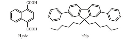 In line with our ongoing efforts to develop functional CPs[8-10], we report two new CPs using the mixed-ligand strategy in which 1, 4-naphthalenedicarboxylic acid (H2ndc) and 9, 9′-dihexyl-2, 7-di(pyridin-4-yl) fluorene (hfdp) (Scheme 1) were employed to construct {[M(hfdp)(ndc)(H2O)]·DMA}n systems, where M=Co (1), Cd (2), and DMA=N, N-dimethylacetamide. Single- crystal X-ray diffraction reveals the metal centers (Co2+/Cd2+) in 1 and 2 are bridged by ndc2- and hfdp ligands, forming 2D networks. Moreover, the fluorescent sensing properties of 1 and 2 have been studied in detail.