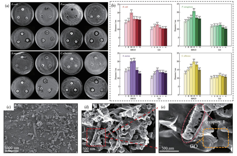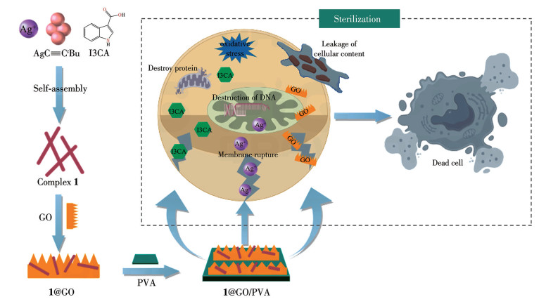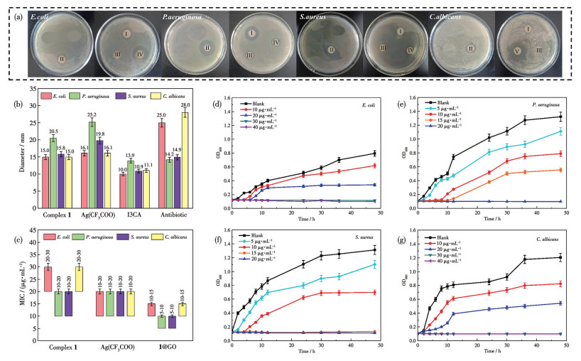 • The antimicrobial activities of silver(Ⅰ) complexes can be enhanced by increasing the content and release of silver ions, which may also cause potential toxicity. Additionally, the powder form of silver(Ⅰ) complexes is not advantageous for clinical applications. To address the above challenges, an antimicrobial film based on silver(Ⅰ) complex was constructed through the following three design strategies. First, complex 1 was self-assembled using an antimicrobial ligand (indole-3-carboxylic acid) and tert-butylacetylene silver to enhance antimicrobial effects by releasing Ag+ and antimicrobial ligands simultaneously. Then, the third antimicrobial source, i.e., graphene oxide (GO), was introduced to prepare 1@GO composite with GO addition optimized by antimicrobial performance. Finally, 1@GO/PVA film was prepared by selecting polyvinyl alcohol (PVA) as a matrix for potential applications. The structure, photostability, and solution stability of 1 were characterized by IR spectra and powder X-ray diffraction. Ag+ releasing test showed the enhanced pH-responsive Ag+ release of 1. The results of the inhibition zones test showed weak antimicrobial effects of GO (1 000 μg·mL-1) on Escherichia coli (E. coli), Pseudomonas aeruginosa (P. aeruginosa), Staphylococcus aureus (S. aureus), and Candida albicans (C. albicans) with increased inhibition zone diameters of 1.1, 2.5, 3.5, and 1.8 mm, respectively. 1 showed good broad-spectra antimicrobial activities against the four microorganisms, and diameters of inhibitory zones increased by 5.0, 10.5, 5.8, and 5.0 mm, respectively. SEM images of 1@GO (1∶1 of mass concentration ratio) exhibited that 1 was dispersed evenly in GO, exposing a large number of sharp edges. The diameters of inhibition zones for 1@GO(1∶1) against E. coli, S. aureus, and C. albicans increased by 6.2, 10.4, and 9.8 mm, respectively, which are larger than the algebraic sum of respective contributions of 1 and GO to the diameter of inhibition zones (6.1, 9.3, and 6.8 mm). This result indicated clearly the successful realization of synergistic antimicrobial effects of silver complex and GO. Minimum inhibitory concentration (MIC) results exhibited the best inhibitory effect of 1 on P. aeruginosa and S. aureus with low MIC values of 20 and 15 μg·mL-1, respectively. After adding GO, MIC values of 1@GO against E. coli, P. aeruginosa, S. aureus, and C. albicans reduced to 5-10 μg·mL-1, 5-10 μg·mL-1, and 10-15 μg·mL-1, respectively. 1(0.5%)@GO(1∶1)/PVA film displayed good antimicrobial properties for four strains, with the largest diameter of inhibition zones of 18.5 mm against P. aeruginosa.