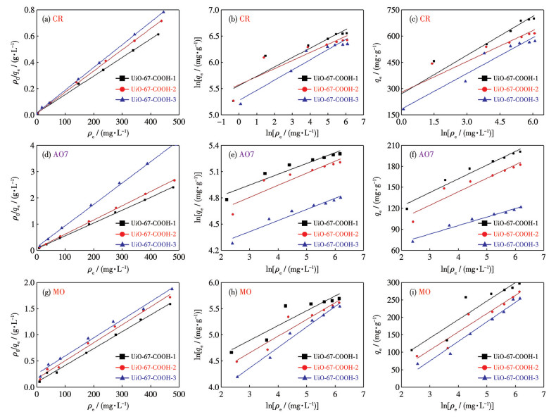 • The carboxyl-modified UiO-67 nanomaterials (UiO-67-COOH) were synthesized by the solvothermal method, in which 4, 4′-biphenyldicarboxylic acid and 1, 1′-biphenyl-3, 4′, 4-tricarboxylic acid, and ZrCl4 were adopted as ligands and metal salt, respectively. The maximum adsorption capacities of carboxyl-modified UiO-67 were 698.7, 295.9, and 200.8 mg·g-1 for Congo red (CR), methyl orange (MO), and acid orange 7 (AO7), respectively, indicating that they exhibit superior dye removal performance. The removal efficiency of UiO-67-COOH toward CR, MO, and AO7 decreased with the electrostatic interaction, π-π interactions, adsorption space, and steric hindrance effect.