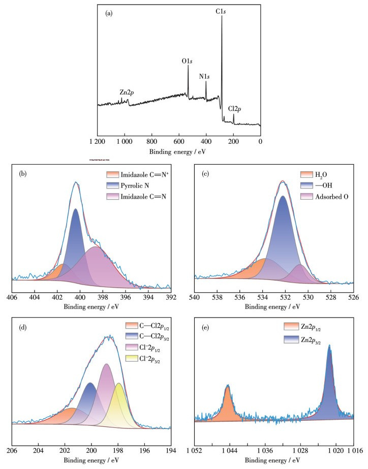 Survey (a), N1s (b), O1s (c), Cl2p (d), and Zn2p (e).