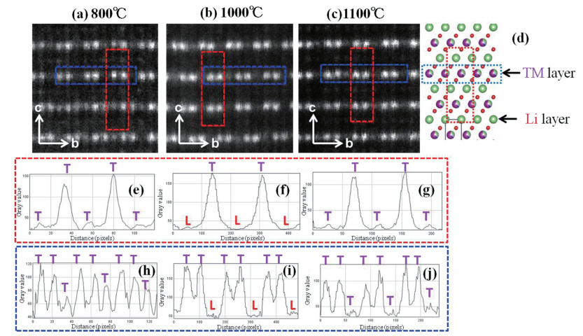 In e-j,“T”and“L”denote regions of high probability distribution for transition metals (Mn/Co/Ni) and Li+ ions, respectively.