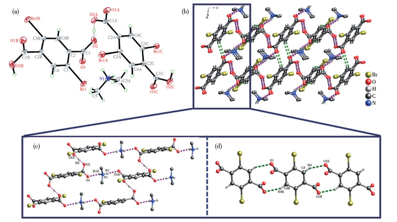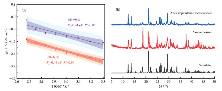 • To address the pressing demand for proton-conducting materials with enhanced environmental adaptability and long-term stability, an ionic hydrogen-bonded organic framework (iHOF 1) was successfully constructed via a solvothermal method using 2, 5-dibromoterephthalic acid (H2BDC-Br2) as the building block. Its crystal structure, stability profiles, proton transport behavior, and photoluminescent properties were systematically investigated by a combination of characterization techniques, including single-crystal X-ray diffraction, powder X-ray diffraction, electrochemical impedance spectroscopy, solid-state fluorescence spectroscopy, etc. Structural analysis reveals that iHOF 1 crystallizes in the monoclinic space group C2/c, with its 3D framework stabilized by robust intermolecular H-bonds and electrostatic interactions between HBDC-Br2- anions and (Me2NH2)+ cations. Proton conductivity measurements demonstrate a distinct dependence on both temperature and relative humidity (RH), reaching a maximum value of 1.72×10-3 S·cm-1 at 100 ℃ and 98% of RH. Activation energy calculations yield values of 0.44 eV (at 68% of RH) and 0.41 eV (at 98% of RH), confirming that proton transport within the framework follows the Grotthuss hopping mechanism. This efficient proton conduction is facilitated by a contiguous H-bonded network formed by hydrophilic carboxyl groups, bromine atoms, and (Me2NH2)+ cations in the framework. Stability assessments indicated that iHOF 1 possessed excellent thermal stability (decomposition temperature: 230 ℃) and chemical stability, as evidenced by the retention of structural integrity after water immersion and prolonged electrochemical testing. Furthermore, upon excitation at 324 nm, the material exhibited a strong and monochromatic blue emission peak at 432 nm, which originates from the ππ* transition of the aromatic moieties and is significantly enhanced by the confinement effect of the rigid framework.