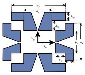 本工作所设计的阶梯电极离子阱的截面结构示意图如图 1所示,其阶梯电极分为上下二层,ax,ay分别为阶梯电极较宽一层电极的宽度,ax=ay=10 mm。h1x,h1y,h2x,h2y分别为上下二层阶梯电极的高度。bx,by分别为阶梯电极较窄一层电极的宽度,在理论模拟中,通过调节bx,by等参数来实现优化电场分布。每个电极上都有一个漏斗形的离子引出狭缝,离子引出狭缝朝向离子阱内部一端的宽度为0.8 mm,X0、Y0为阶梯电极离子阱内部的电场分布矩形空间的尺寸,Y0=5 mm。因此,可以通过改变X0的大小实现场半径比例的变化。在理论模拟中,为简化模拟过程和时间,对几何结构参数进行了简化,使得可调节的几何参数仅包括X0、阶梯电极高度h=h1x=h1y和宽度b=bx=by。