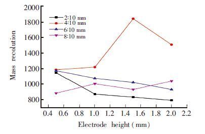离子阱的几何结构直接决定了阱中的电场分布。在众多几何结构参数中,场半径比例(X0/Y0) 一直是主要因素之一。本工作中,在固定X0/Y0=6∶5条件下,首先考察了阶梯电极高度以及宽度对质量分辨的影响。可以看到阶梯电极离子阱模拟分辨率与阶梯电极高度(h1=0.5,1.0,1.5,2.0 mm)的变化关系,如图 2所示。对于阶梯宽度b分别为2和6 mm的结构,阶梯电极离子阱的分辨率都是随着阶梯电极高度的递增而下降; b=8 mm的阶梯电极离子阱的分辨率随阶梯电极高度的递增有很小的上升波动; b=4 mm的阶梯电极离子阱的分辨率先上升后下降。通过调整阶梯电极的宽度b及高度h1,可以获得一个初步优化结构的阶梯电极离子阱(X0×Y0=6 mm×5 mm,a×b=10 mm×4 mm,h1×h2=1.5 mm×1.5 mm),该结构阶梯电极离子阱的模拟分辨率为1880。