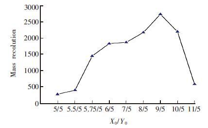 在此基础上,进一步利用Axsim软件考察了阶梯电极离子阱的质量分辨能力与场半径比例X0/Y0的关系。如图 3,不同场半径比例(5/5,5.5/5,5.75/5,6/5,7/5,8/5,9/5,10/5,11/5)下阶梯电极离子阱的模拟分辨率分别为282,410,1457,1880,2183,2743,2207,595,表明了x方向电极拉伸对提高离子阱分辨率的效果,不拉伸以及拉伸过度都无法获得较高的分辨能力。通过调整阶梯电极的宽度、高度、场半径比例,可以获得一个优化结构的阶梯电极离子阱(X0×Y0 = 9 mm×5 mm,a×b=10 mm×4 mm,h1×h2=1.5 mm×1.5 mm),分辨率为2743。
