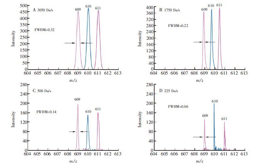 在众多影响离子阱质量分析器分辨能力的因素中,降低射频电压扫描速度可以有效提高质谱的分辨率。因此考察了射频电压扫描速度对阶梯电极离子阱质量分辨能力的影响。如图 4所示,射频电压扫速分别为3050,1750,500和225 Da/s,可以计算得到它们对应的分辨率分别为1903,2768,4350和10150,由此可知,随着扫速减小,阶梯电极离子阱的分辨率明显提高。在225 Da/s扫速时,对于m/z 609的离子获得了10150的模拟分辨率。
