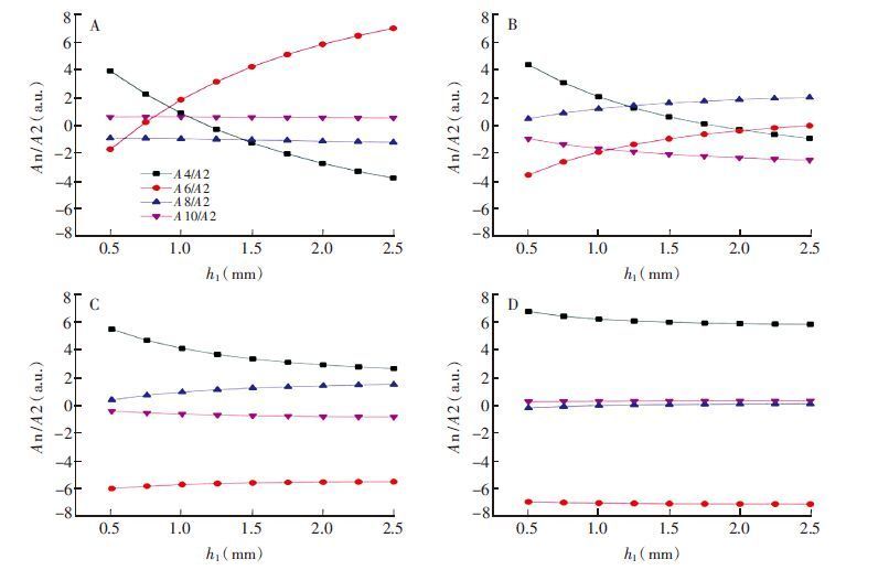 Geometry (mm) A2 A4 (%,A4/A2) A6 (%,A6/A2) A8 (%,A8/A2) A10 (%,A10/A2) X0/Y0=6/5,b/a=2/10,h1=0.5 0.8107 0.0321(3.97) -0.0135(-1.669) -0.0070(-0.865) 0.0053(0.65) X0/Y0=6/5,b/a=6/10,h1=0.5 0.8678 0.0478(5.51) -0.05223(-6.024) 0.0037(0.42) -0.0034 (-0.39) X0/Y0=6/5,b/a=8/10,h1= 2 0.8767 0.0512(5.84) -0.0630(-7.19) 0.00027(0.03) 0.0022(0.25) X0/Y0=6/5,b/a=4/10,h1=1.5 0.8347 0.0050(0.6) -0.0083(-0.99) 0.0134(1.6) -0.0177(-2.12) X0/Y0=7/5,b/a=4/10,h1=1.5 0.6822 0.0019(0.28) -0.0060(-0.886) 0.0132(1.94) -0.0127(-1.86) X0/Y0=8/5,b/a=4/10,h1=1.5 0.5644 -0.0005(-0.087) -0.0055(-0.97) 0.0112(1.99) -0.0102(-1.81) X0/Y0=9/5,b/a=4/10,h1=1.5 0.4746 -0.0024(-0.51) -0.0052(-1.1) 0.0095(2.0) -0.0086(-1.81) X0/Y0=10/5,b/a=4/10,h1=1.5 0.4064 -0.0038(-0.95) -0.0051(-1.25) 0.0083(2.03) -0.0074(-1.82) X0/Y0=11/5,b/a=4/10,h1=1.5 0.3531 -0.0046(-1.31) -0.0048(-1.36) 0.0072(2.05) -0.0065(-1.83) -