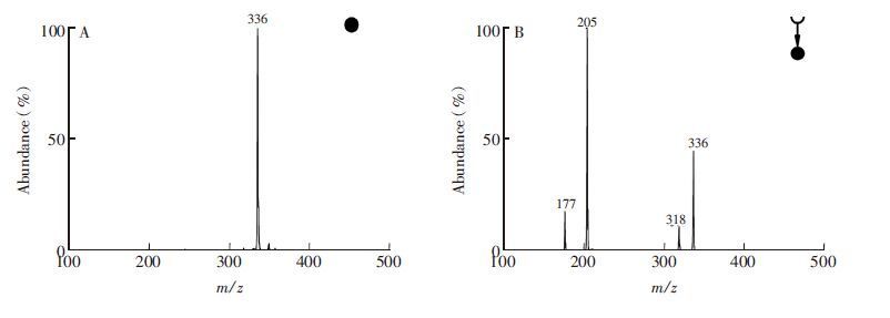 串级质谱分析是离子阱质量分析器最独特的优点之一。因此,对于一个新型结构的阶梯离子阱质量分析器,具备良好的串级质谱分析功能是最基本的功能之一。在实验过程中,先对电喷雾电离产生的三肽Gly-Phe-Leu母体离子峰(m/z=336) 进行隔离,隔离方式采用DAWI[30]方法,得到的质谱结果如图 8A所示。被隔离的母离子通过常规的改变数字激发方波频率的方法实现碰撞诱导解离。在碰撞诱导解离阶段中,数字束缚方波频率为110 kHz,解离阶段持续时间为40 ms。图 8B是三肽Gly-Phe-Leu的解离碎片谱图,包括了碎片离子峰m/z 318,205和177的质谱信号,与其它离子阱质量分析器串级质谱分析结果一致,表明阶梯电极离子阱具有传统离子阱所具备的串级质谱分析功能。