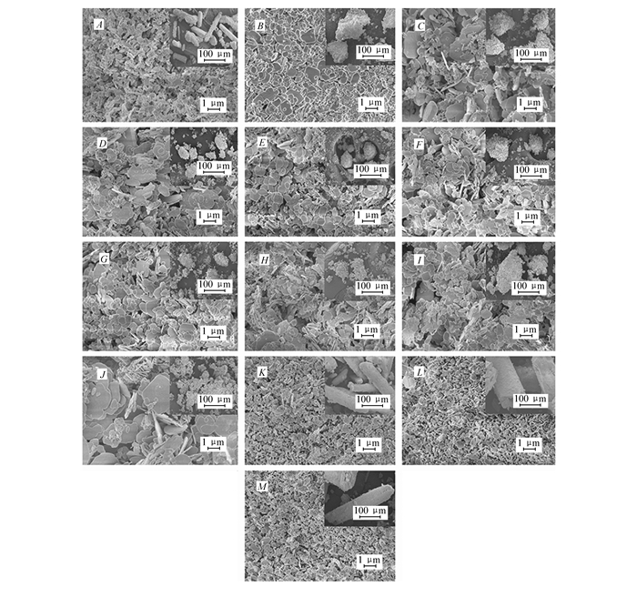 A.no surfactant; B.CTAB-0.3 g; C.CTAB-0.6 g; D.CTAB-1 g; E.SDS-0.3 g; F.SDS-0.6 g; G.SDS-1 g; H.SDS+CTAB-0.3 g; I.SDS+CTAB-0.6 g; J.SDS+CTAB-1 g; K.PEG-0.3 g; L.PEG-0.6 g; M.PEG-1 g