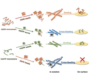 Seeding and Cross-Seeding Aggregations of Aβ40 and hIAPP in Solution and on Surface