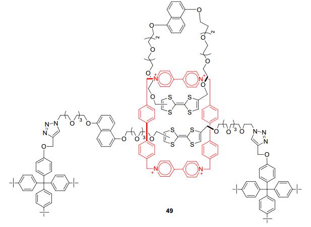 2011年, Stoddart等[58]设计构筑了更为复杂的含TTF单元和对二甲联苯基桥联的联吡啶环番的机械互联锁结构49(图 2).实验表明49诱导氧化后, 存在平移和旋转运动, 该研究对实现完成从简单分子开关的转变到多态变换的复杂分子机器构筑以及提高分子器件的信息存储具有重大意义.