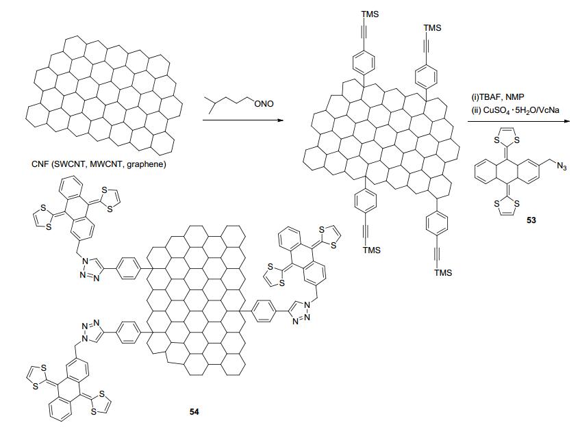 纳米科学和纳米技术的发展加快了富勒烯、碳纳米管、石墨烯等碳纳米材料的开发与利用. 2015年, Martín等[61]利用自由基诱导碳纳米材料(CNF), 如单壁碳纳米管(SWCNT)、多壁碳纳米管(MWCNT)和石墨烯(G)等发生自由基加成反应得到含端基炔的纳米碳底物, 其再与含端基叠氮基的exTTF衍生物53通过CuAAC点击反应得到含有电化学活性单元的相应碳纳米功能(CNF)材料54 (Scheme 10).电化学实验表明exTTF单元的呈现双电子准可逆氧化还原过程.光激发实验表明单壁碳纳米管(SWCNT) 54可以形成电荷分离状态, 对于开发新型光电材料具有重要意义.