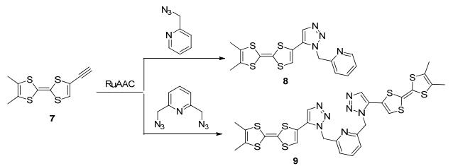 2012年, Avarvari等[26]利用CuAAC和RuAAC两种催化剂将含三甲基硅烷(TMS)保护基的端基炔TTF衍生物1和苄基叠氮点击合成1, 4-和1, 5-取代的1, 2, 3-三氮唑TTF衍生物2和3 (Scheme 1).循环伏安法实验表明, 异构体化合物2和3都是良好的电子供体化合物, 但它们供电子行为差异较大.化合物2的第一和第二半波电位均小于化合物3的相应电位, 差值均在0.1 V附近.紫外光谱实验表明, 在分子内存在从TTF单元向三氮唑单元的电子转移过程.密度泛函理论(DFT)计算结果也反映了异构体2和3的给电子能力和电子转移行为的差异性. 2014年, 该课题组利用RuAAC反应将双三甲基硅烷(TMS)保护基的端基炔TTF衍生物4和苄基叠氮点击合成TTF衍生物5和6 (Scheme 1).晶体X射线分析表明, 晶体6的结构与3b的结构差异性大, 主要归因于6中两个三氮唑基团的空间位阻作用.紫外可见光谱实验表明, 化合物6存在分子内电荷转移行为[27], 质子化6的紫外光谱红移更明显.为考察功能取代基的影响, 同年, 该课题组利用RuAAC点击反应合成了含吡啶功能基的TTF衍生物8和9 (Scheme 2)[28].晶体结构表明化合物9呈钳子型结构, 两个TTF单元平行排列.循环伏安法实验表明化合物9的第一个氧化峰裂分, 主要是由于分子中两个TTF单元能通过空间发生相互作用, 使得两个TTF单元第一氧化电位不同, 说明化合物9在溶液中仍保持钳子型分子结构.