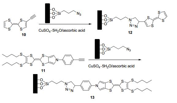 2014年, Salinas等[29]将含叠氮端基的负载有双吡啶钌[Ru(bipy)3]2+染料的硅烷化材料和含端基炔基的TTF衍生物10和11利用CuAAC反应制备出新型的门控介孔材料12和13 (Scheme 3), 利用TTF的供电子性质, 其可以与含硝基芳香类炸药如三硝基苯甲硝胺(Tetryl)、三硝基甲苯(TNT)、三硝基苯(TNB)形成电荷转移复合物.实验表明此门控介孔材料可以作为硝基芳香类炸药的荧光检测探针而广泛应用.